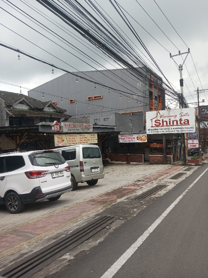 A street scene features the "Warung Sate Shinta" restaurant with parked cars outside