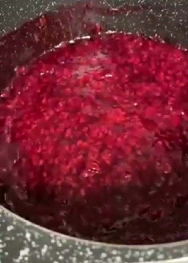 A close-up shot shows a pot filled with a mixture of dark red berries and liquid, boiling on a stovetop