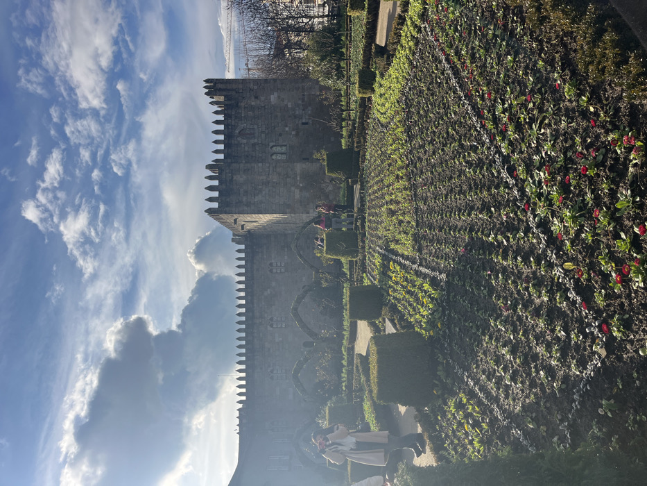 A tall, stone castle with battlements stands against a backdrop of blue sky and white clouds. The castle is adjacent to a formal garden with manicured hedges and rows of flowering plants. People are seen walking and posing in the garden near the castle. The light suggests it is a sunny day.