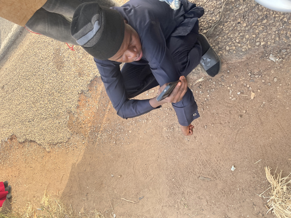 The scene depicts a young adult male crouching on the edge of a reddish-brown dirt path that abuts a light brown gravel road in Keffi, Nigeria. He is wearing a dark blue long-sleeved tunic and trousers, a black beanie with grey stripes, and a black slide sandal on his right foot over a dark sock; his left foot is bare. His head is bowed, and his gaze is directed downwards at a black smartphone held in his right hand. His left hand is clenched. Partially visible in the top left are the lower legs and feet of an individual wearing red clothing. In the top right, the lower legs of another individual in grey trousers are partially visible. The dirt path shows faint tire tracks and scattered dry straw-like grass in the lower left, along with a small piece of white litter near the crouching male's left knee. Natural light illuminates the outdoor environment.