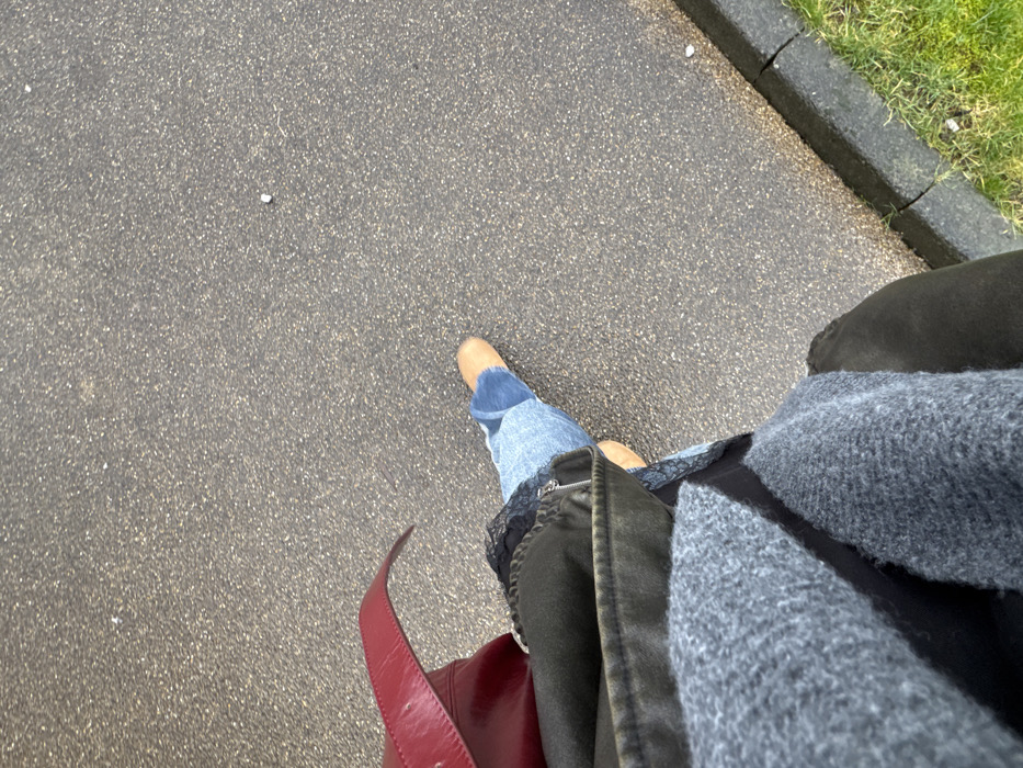 A first-person, downward-facing perspective captures the lower body of an individual standing or walking on a dark grey asphalt surface. The individual is wearing blue denim jeans with frayed cuffs, tan flat shoes, a dark garment with a visible lace trim, a dark jacket or coat with a zipper detail, and a grey textured scarf or similar fabric. A dark red leather bag with a visible strap is positioned on the left side of the frame. The asphalt pavement appears slightly damp, revealing light-colored aggregate, and contains two small white flecks of debris. A dark curbstone delineates the right edge of the pavement, bordering a patch of green grass in the bottom right corner. No specific visual identifiers within the image indicate its location within the city of Hull, United Kingdom.