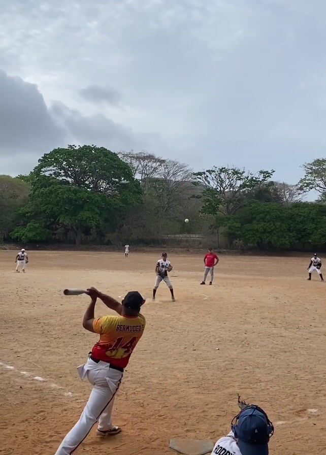 A baseball batter is seen hitting a ball on a dirt field under a cloudy sky. The batter is wearing a red and yellow jersey and white pants. Several fielders wearing different uniforms are visible in the background. A catcher in a blue jersey and helmet is behind the batter. A red shirted person is standing in the field. The outfield consists of trees and brush.