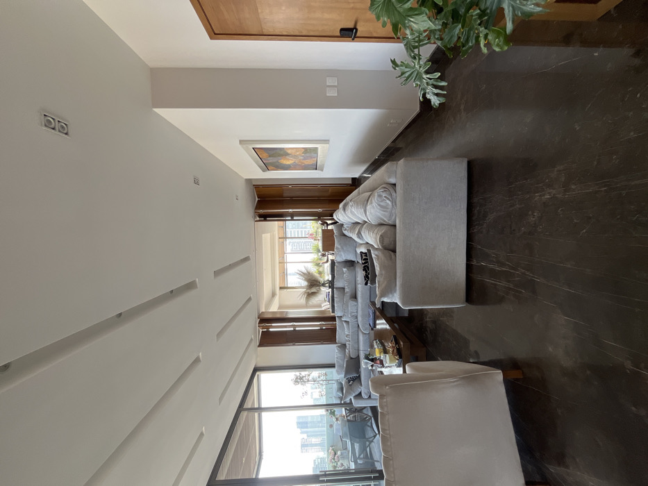 A modern living room features a large sectional sofa with numerous pillows, facing a window with a city view. A white armchair sits nearby. Dark marble flooring contrasts with the light-colored furniture and white walls, which have recessed linear details. A plant is in the upper right corner. Artwork is above the sofa.