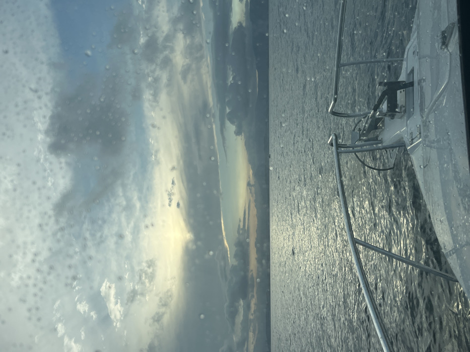 The scene presents a marine view from the bow of a white vessel, likely a motor yacht, situated on the waters offshore of Port Kembla, Australia, looking towards the distant coastline. The immediate foreground displays the boat's white foredeck, equipped with stainless steel bow rails and an integrated anchor roller system. The viewing surface, possibly a window or camera lens, is covered with numerous small, distinct water droplets. The midground consists of a vast expanse of dark, rippled water, reflecting the overcast sky. In the background, a low-lying landmass stretches across the horizon, consistent with the Port Kembla shoreline, with subtle elevated terrain or structures visible in the distance. A single, small, dark vessel is discernible on the water in the middle-right portion of the background. The sky above is largely overcast with stratified grey and blue clouds, featuring a prominent, diffuse yellowish-white light source on the left horizon, indicating either sunrise or sunset. No individuals or direct interactions are depicted.