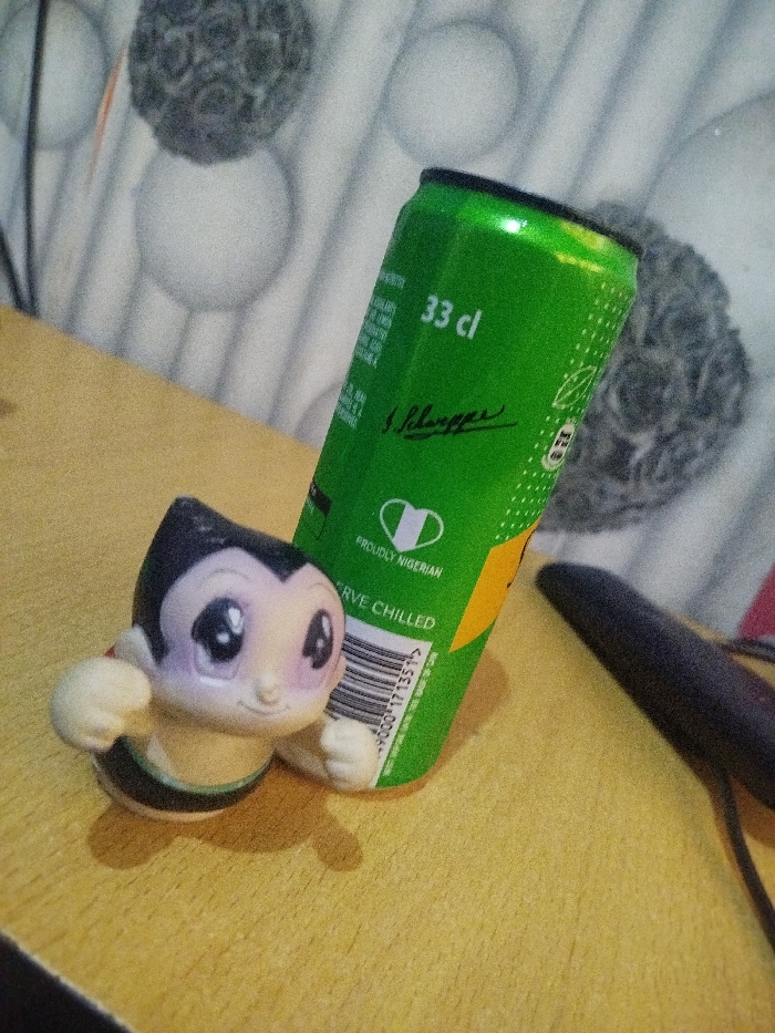 This image, taken in Ilado, Nigeria, depicts an indoor scene. A green aluminum beverage can, labeled "Schweppes" with "33 cl" and "PROUDLY NIGERIAN" text, stands upright on a light brown wooden surface. A small figurine, resembling Astro Boy with black hair, large purple eyes, and a black and green suit, is positioned in front of and slightly to the left of the can. The figurine has its fists clenched. In the background, a patterned wall or fabric features multiple white and grey spherical objects. A dark, thin object, possibly a cable, is partially visible on the wooden surface to the right of the can.
