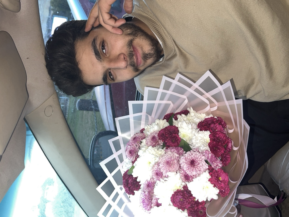 The scene is located within a vehicle in the city of Al-Muhajerin Municipality, Syria. A young adult male, with dark hair and a short beard, is positioned on the right side of the frame, looking directly at the viewer with a slight smile. He wears a light tan, long-sleeved sweater. His right hand is raised, with fingers touching the area near his right temple. A large bouquet of chrysanthemums, featuring white, light pink/mauve, and dark pink/magenta blooms, is prominently displayed in the left and central portions of the image. The bouquet is wrapped in a structured, semi-transparent paper with a geometric pattern and secured with a pink ribbon visible at the bottom. The background consists of the vehicle's light-colored interior components, including the headliner and A-pillar. Through the vehicle's windows, a blurred exterior environment, including hints of greenery and another vehicle, is visible. The individual is posing for a photograph while holding the floral arrangement.