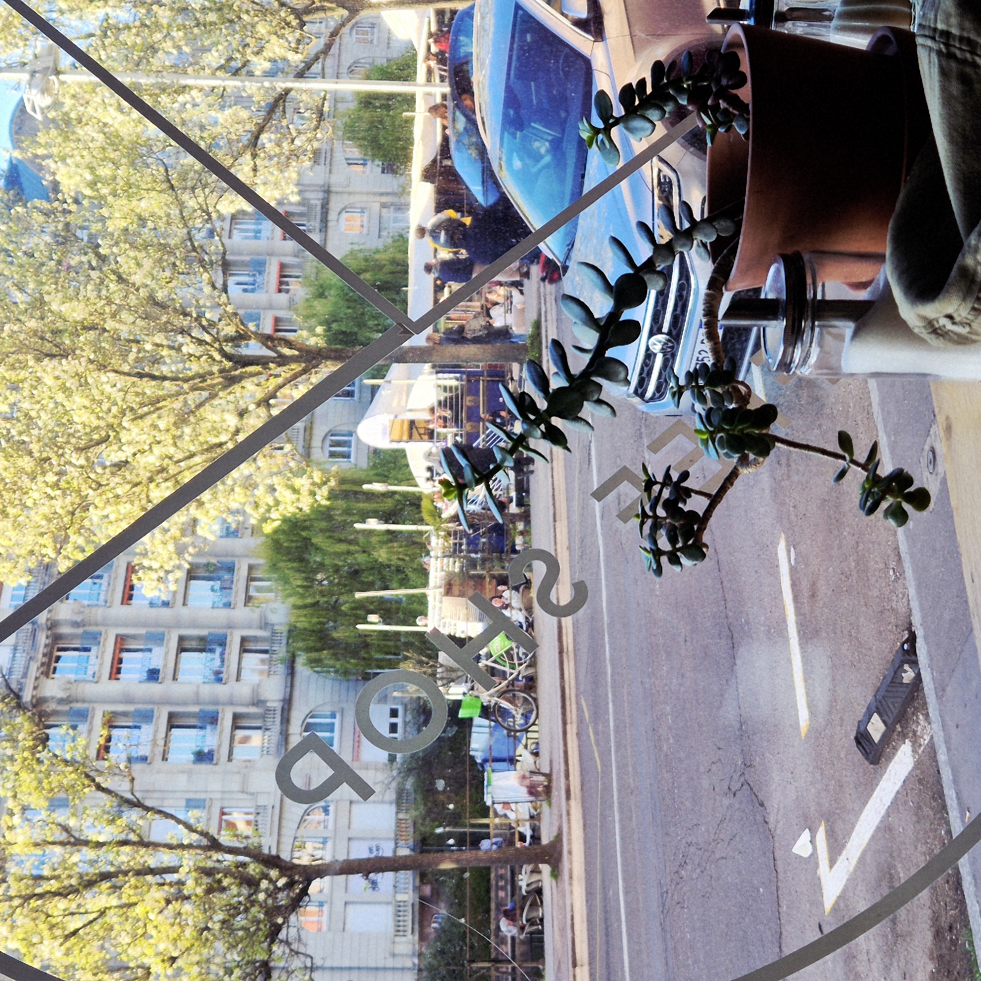 The image depicts an outdoor urban scene in Strasbourg, France, viewed from inside a building through a window with semi-transparent graphic overlays. **Location:** The grand, multi-story building in the background, with its light-colored stone facade, classical columns, ornate balustrades, and numerous windows (some with red awnings), is characteristic of the architecture found in Strasbourg's Neustadt (German Quarter). Specifically, this style is prominent around **Place de la République or along Avenue de la Liberté**, where large boulevards meet the Ill River. The presence of trees in bloom and an outdoor market further supports this general area. **Scene Description:** The vantage point is from a café or similar establishment, looking outwards. In the immediate foreground, a potted jade plant (Crassula ovata) in a terracotta pot sits on a wooden surface, with a glass sugar dispenser positioned to its right. A crumpled light-colored fabric object is visible below these items. Grey diagonal lines and partially visible grey letters ("P", "O", "T", "S", "?", "L") are superimposed across the image, indicating they are graphics or text on the viewing window. Beyond the window, an asphalt road runs horizontally across the midground. It features a solid white lane divider and a dashed yellow line marking the shoulder. Debris, including a small white triangular object and a black rectangular object, is visible on the road's edge. A light-colored compact SUV, possibly a Volkswagen, is parked facing the viewer on the right side of the road, partially obscured by the plant. A dark-colored car is parked behind it. Across the street, a tree-lined strip with several mature trees displaying bright green spring foliage and blossoms separates the road from a bustling public space. This space hosts an outdoor event, likely a market or festival, with numerous casually dressed people standing, sitting, and moving about. A white bicycle with a green frame and green saddlebag is parked on the edge of this area. Temporary structures, including stalls and a large white canopy, are visible. People are observed interacting and browsing. In the far background, the aforementioned multi-story building dominates the skyline. It features numerous windows, many with blue frames, and several balconies with elaborate balustrades. Some windows have red retractable awnings, partially extended. The trees in front of this building are also in full spring bloom. The sky above is clear and blue. The overall lighting suggests a bright, possibly late afternoon, spring day.