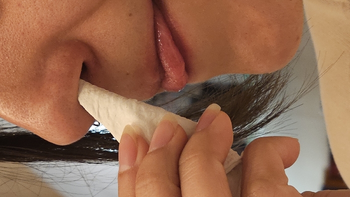 An upside-down close-up shows a person cleaning their nose with a white tissue
