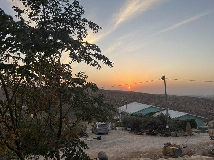 The image captures a sunset scene within the landscape of the city of Unknown, Palestinian Territory. The upper sky is light blue with sparse, linear clouds, transitioning to a bright orange and red gradient at the horizon where a distinct, orange sun is setting. In the foreground, left of center, a tree with dark green foliage bears clusters of small, yellowish-brown fruits. The midground consists of an unpaved area where a silver passenger vehicle with roof rails is parked, facing left. To the right, a utility pole with overhead lines extends towards the horizon. Two single-story buildings, featuring light turquoise exteriors and white gabled roofs, are visible behind a line of smaller trees and bushes, including several olive trees. The front portion of a light brown bus or large van is partially visible on the far right. A yellow compacting machine rests on the ground in the lower right corner. The background reveals a series of distant, arid, and rocky hills under the twilight sky. No people are visible in the scene.