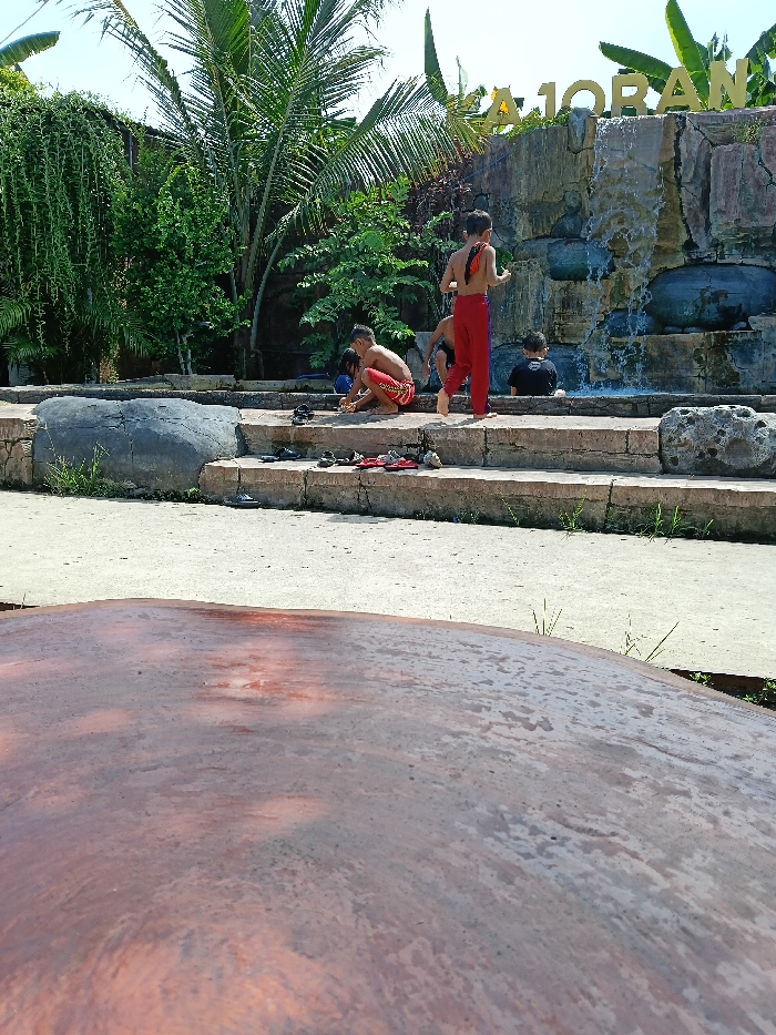 Three boys are near a waterfall feature. One boy wears red pants with no shirt and stands on a step. Another boy in red shorts sits, playing with something on the steps. A third boy in a black shirt is closer to the waterfall. Shoes are scattered on the steps. A concrete ledge is in the foreground. Lush green vegetation and trees, including a palm tree, surround the area. The word "KAJORAN" is displayed on the waterfall feature.