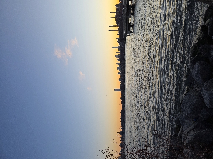- "The image displays a wide-angle view across the East River at sunset or sunrise, observed from the Brooklyn waterfront in New York City, United States, facing towards the Manhattan skyline" by FM-HVR9v2, licensed under CC BY 4.0