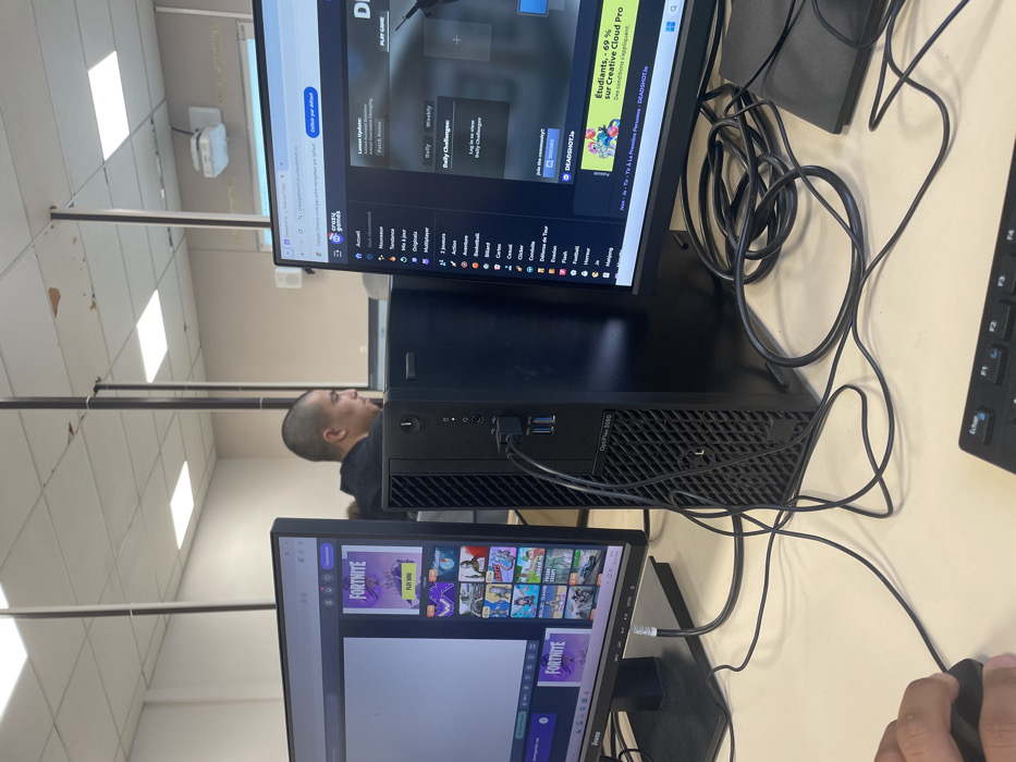 An indoor scene depicts a computer lab or classroom setting in France, consistent with a facility that could be found in Hérouville-Saint-Clair