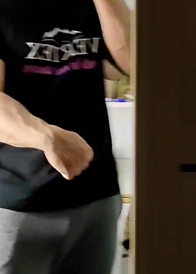 A muscular man stands in front of a mirror in what appears to be a domestic setting, possibly a kitchen or laundry room