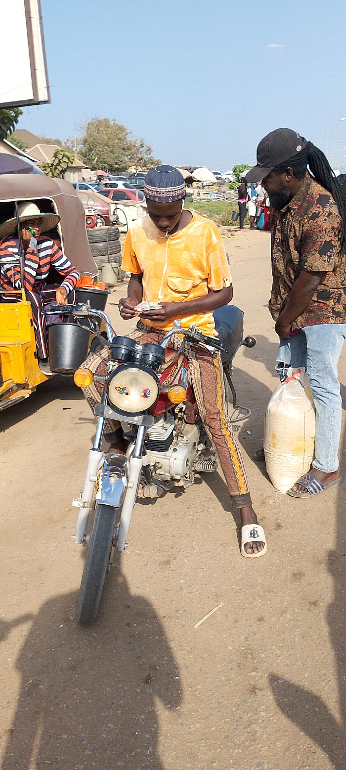 The image portrays an outdoor street scene in Kagini, Nigeria. **People:** * **Subject 1 (Center-left):** A male, seated on a motorcycle, wears a light orange short-sleeved shirt, a dark blue kufi cap with a patterned band, and patterned brown trousers. He has a thin white cord around his neck. His hands are engaged in counting or examining a stack of Nigerian Naira notes. He wears light-colored slides with a dark emblem. * **Subject 2 (Center-right):** A male stands, wearing a dark baseball cap, a patterned long-sleeved shirt (dark with brown/orange/red), light blue ripped jeans, and dark blue and white striped slides. Visible dreadlocks extend from under his cap. He is observing Subject 1. * **Subject 3 (Far-left):** A person, likely female, is seated in the passenger section of a yellow Keke Napep (auto-rickshaw). They wear a wide-brimmed straw hat and a striped red, white, and dark blue top. A green object is near their ear. **Objects:** * **Motorcycle:** A red "BOXER" brand motorcycle, positioned centrally. It has a single headlight with colorful stickers, two amber turn signals, a chrome front fender, and a black seat draped with a brown and gold patterned fabric. * **Currency:** Subject 1 holds multiple Nigerian Naira banknotes, predominantly green and purple. * **Sack:** A large, translucent white sack, filled with a light-colored granular substance, rests on the ground between Subject 2's legs. * **Keke Napep:** A yellow auto-rickshaw is partially visible on the left, with a black bucket inside its passenger compartment. * **Background Vehicles:** Numerous parked cars, including older models, are visible in the mid-ground, along with stacks of tires. * **Structures:** Low-rise buildings with light-colored roofs are present in the distant background. A large, blank white sign structure is partially visible on the far left. **Environment:** * **Ground:** The surface is an uneven, light brown asphalt or dirt road. * **Sky:** The sky is clear and bright blue. * **Lighting:** Strong sunlight illuminates the scene from the left, casting distinct shadows of the subjects and motorcycle towards the right foreground. * **Vegetation:** Sparse trees and shrubs are visible in the background.