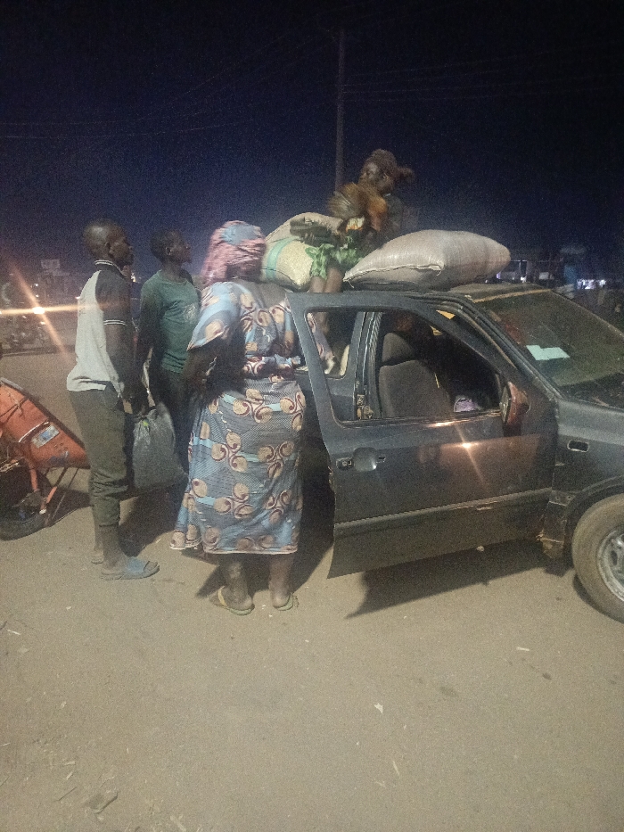 Four people are gathered around a dark gray car with its door open. A woman stands at the open door, while two men stand behind her. A person sits on the roof of the car among what appear to be sacks of goods. The scene is dimly lit, suggesting it is evening or nighttime. There is an orange wheelbarrow to the left and various distant lights.