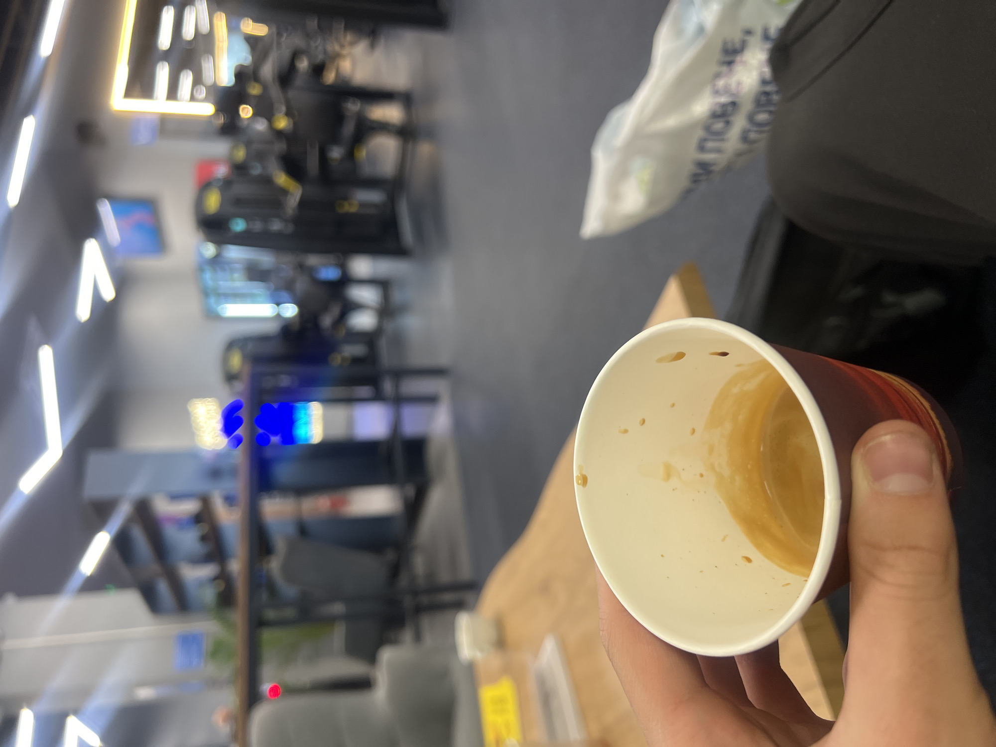 The image depicts an indoor scene within a modern fitness facility, specifically the lounge or cafe area adjacent to the main gym floor. In the foreground, a person's light-skinned hand holds a disposable paper coffee cup, red and orange externally, white internally, containing a shallow amount of light brown liquid consistent with espresso, with residual splashes on the inner rim. In the midground, a light-colored wooden table is visible, hosting blurred objects including a white cup and yellow paper. A portion of a dark grey upholstered chair is also present. The background is a blurred, brightly lit gym area. The ceiling features numerous modern, linear LED light fixtures. Dark-colored gym equipment, primarily weight machines with some yellow accents, is visible on a dark grey floor. A blurred blue neon sign or illuminated display is discernible in the mid-background. To the right, a white plastic bag with partially visible Cyrillic text, including "ПОВЕЧЕ" (Poveche), rests on a dark surface. The overall environment suggests a contemporary and well-maintained fitness center. The location is identified as a **Pulse Fitness & Spa** club in Burgas, Bulgaria, consistent with the architectural style and equipment found at their facility in **Mall Plaza Burgas**.