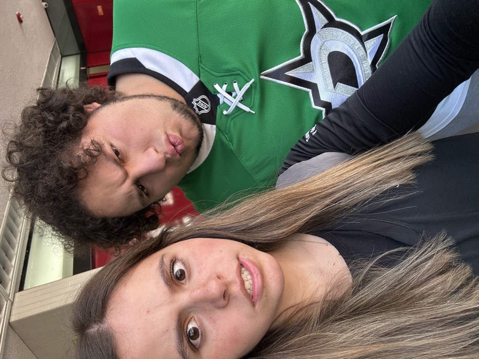 A close-up photograph depicts two individuals, one female and one male, positioned closely against an indistinct architectural background. The female is in the foreground, occupying the left side of the frame. She has long, straight, light brown hair and brown eyes, with visible freckles on her nose and cheeks. She wears a black long-sleeved v-neck top and a grey backpack strap is visible over her right shoulder. Her facial expression shows wide-open eyes and a partially open mouth, exposing her upper teeth. The male is positioned behind and to the right of the female. He has dark, curly hair and facial hair. He is wearing a green Dallas Stars hockey jersey featuring a white collar, white laces, and an NHL shield logo on the collar, along with the Dallas Stars logo on the chest. His expression includes narrowed eyes, furrowed brows, and pursed lips. The background features blurred structural elements, including a red surface behind the male and a light-colored overhead structure. The specific location within the city of Interlomas, Mexico, is not identifiable from the visual content.