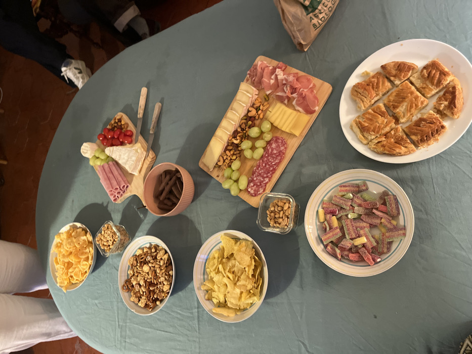 A variety of foods are arranged on a turquoise tablecloth. There are two charcuterie boards with cheeses, meats, grapes, nuts, and tomatoes. There are also bowls of cornflakes, mixed nuts, chips, a bowl of chocolate sticks, a plate of candies, and a plate of pastry. There is a brown bag on the upper right corner.