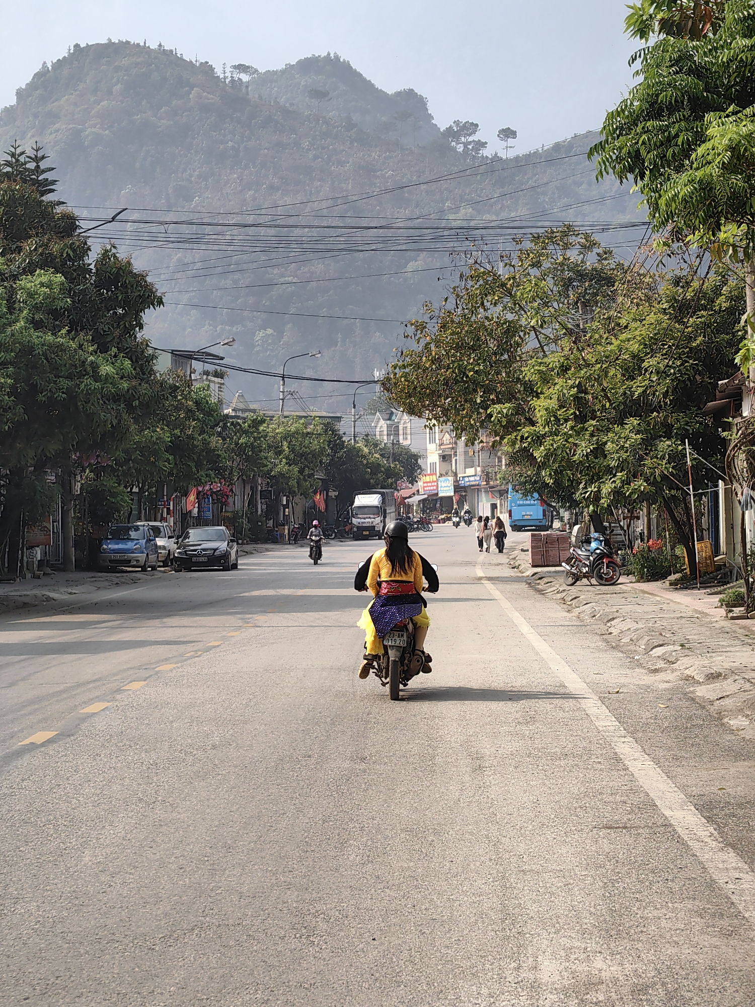 A straight shot of a street in Mèo Vạc Commune, Vietnam, shows a person riding a small motorcycle away from the viewer on the right side of a paved road. The road runs towards a distant mountain backdrop with overcast skies. Trees line both sides of the road, and parked cars and motorcycles are visible on the left. Several pedestrians walk on the right sidewalk. Utility poles and lines traverse the street overhead. The motorcycle rider is wearing a yellow dress and a black helmet. The license plate of the motorcycle is partially visible.