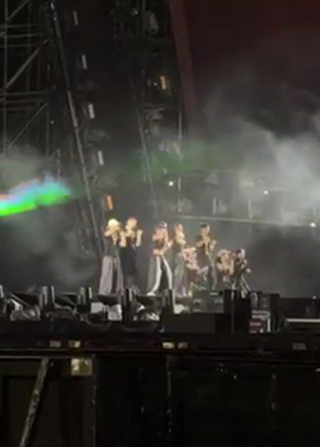 A group of performers is on stage against a backdrop of scaffolding, lights, and smoke. Seven individuals, some wearing hats, are positioned across the stage, visible from the waist up. They perform choreographed movements with their hands, often pointing upward. Lighting effects, including green and white beams, add to the stage's ambiance. The lower portion of the stage structure is visible below the performers, suggesting an elevated platform.
