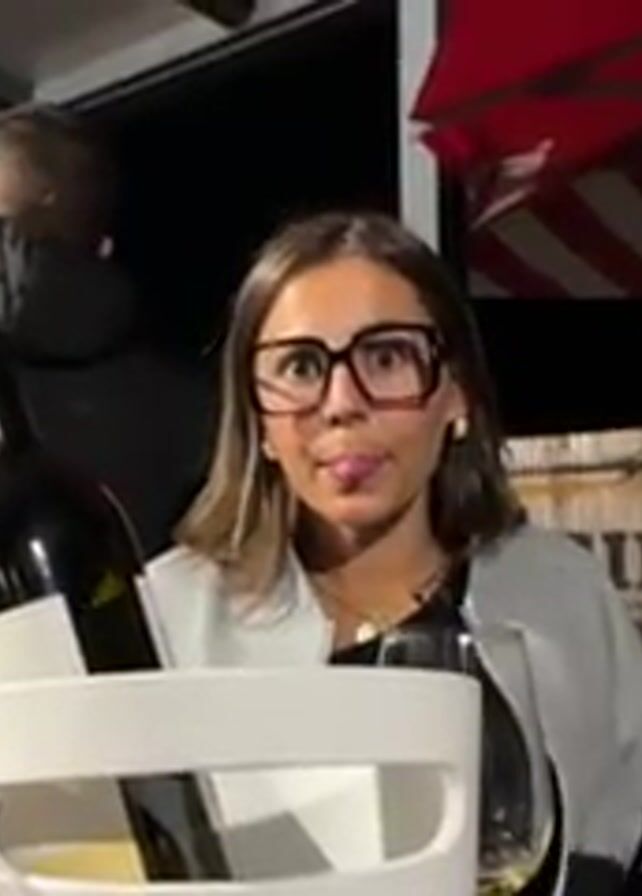 A woman with square glasses is sticking her tongue out and then looking seriously into the distance. She is standing behind a table filled with wine glasses. A wine cooler with a wine bottle in it is in front of her. She is wearing a grey jacket. There are people in the background, along with a striped umbrella.