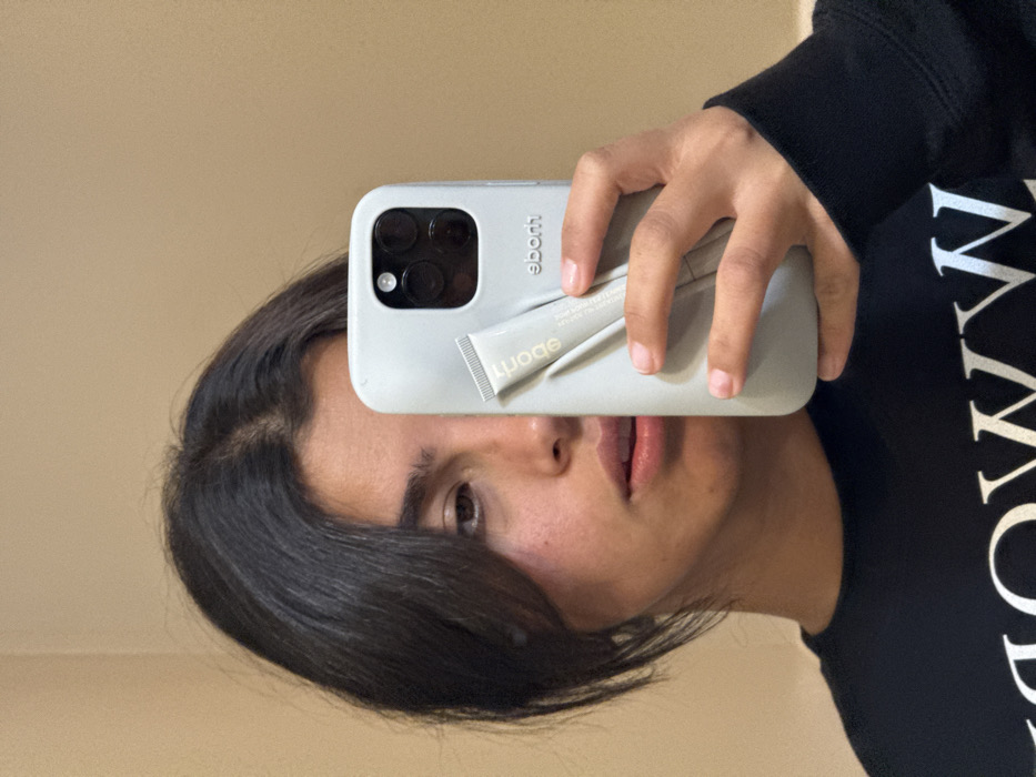 The image is a mirror selfie depicting a young adult female indoors. She has dark hair, a neutral expression, and is wearing a black long-sleeved top with partial white lettering ("OW" in reverse) visible at the bottom left. Her right hand, in the foreground, holds a light grey cased iPhone. The phone case, identified by the mirrored debossed text "hrobee" (originally "eborh"), encases an iPhone model with a prominent triple-camera system. A small, light grey tube, likely a cosmetic product, is held against the phone case. The tube displays reversed text, notably "aboqe" and "HYDRATING EYE CREAM / CRÈME YEUX HYDRATANTE". The background consists of a plain, light brown wall. The image provides no discernible visual information to ascertain a specific location within the city of Princeton, United States.