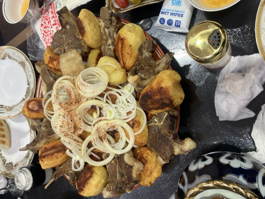 A platter of meat and potatoes is topped with sliced onions and a light dusting of paprika. Surrounding the platter are various dishes and eating utensils. A gold-colored spice shaker and a packet of wet wipes sit nearby. The presentation suggests a hearty meal shared among friends or family.