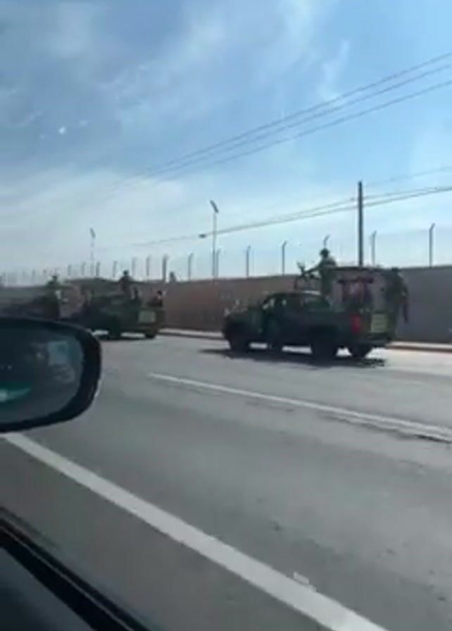 convoy of military vehicles on a highway next to a high fence. The vehicles are painted in camouflage and have soldiers standing on top. There is a road barrier blocking the road. The sky is blue with some clouds and power lines run parallel to the road. The video is taken from a moving vehicle on the opposite side of the road.
