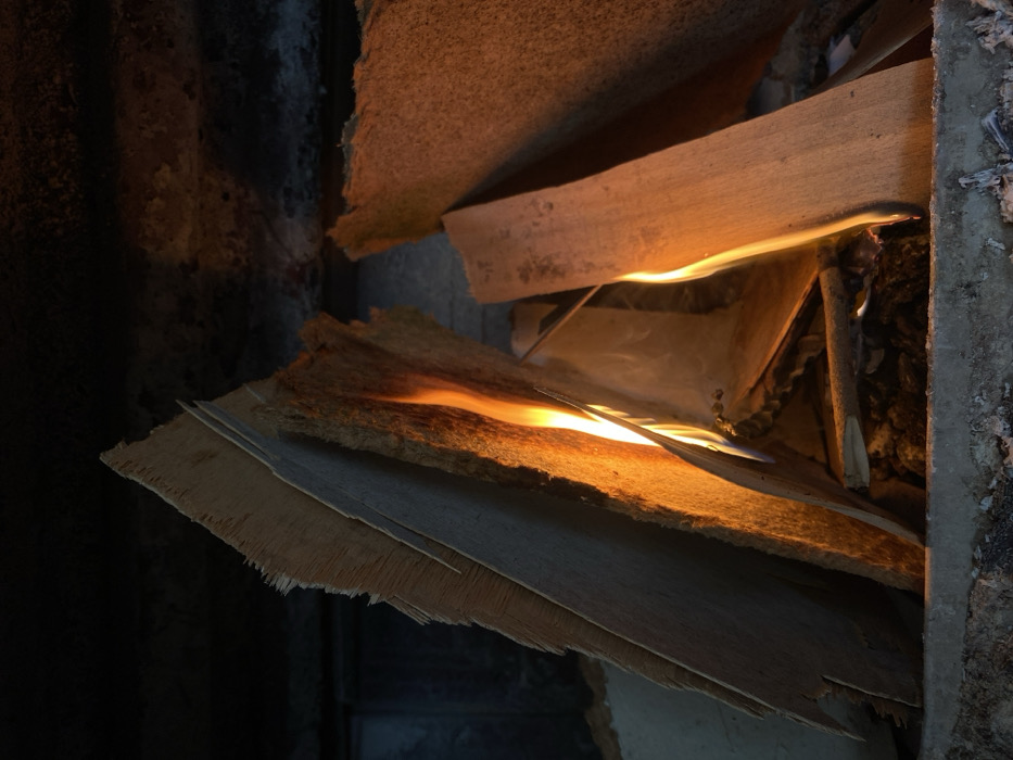The image displays a contained fire burning within an enclosed dark space, consistent with a fireplace or stove. Several pieces of irregularly shaped, flat wood or wood-composite material are arranged vertically, forming a roughly triangular structure. The edges of these materials, particularly on the left, appear frayed and unfinished. Bright orange and yellow flames are actively consuming the wood, primarily concentrated in the central area, casting a warm glow on the adjacent surfaces. Faint smoke is visible rising from the burning material. The fire rests on a light grey, concrete-like base covered with white and grey ash. The background is dark and indistinct, with some textured surfaces in the upper right. No individuals, animals, or external identifying markers are present. The precise location in Dobri dial, Bulgaria, cannot be determined from the visual evidence within the image.