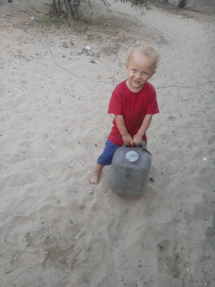 A young child, appearing to be a toddler, stands outdoors on sandy ground in a location identified as Al-Mawasi, Unknown