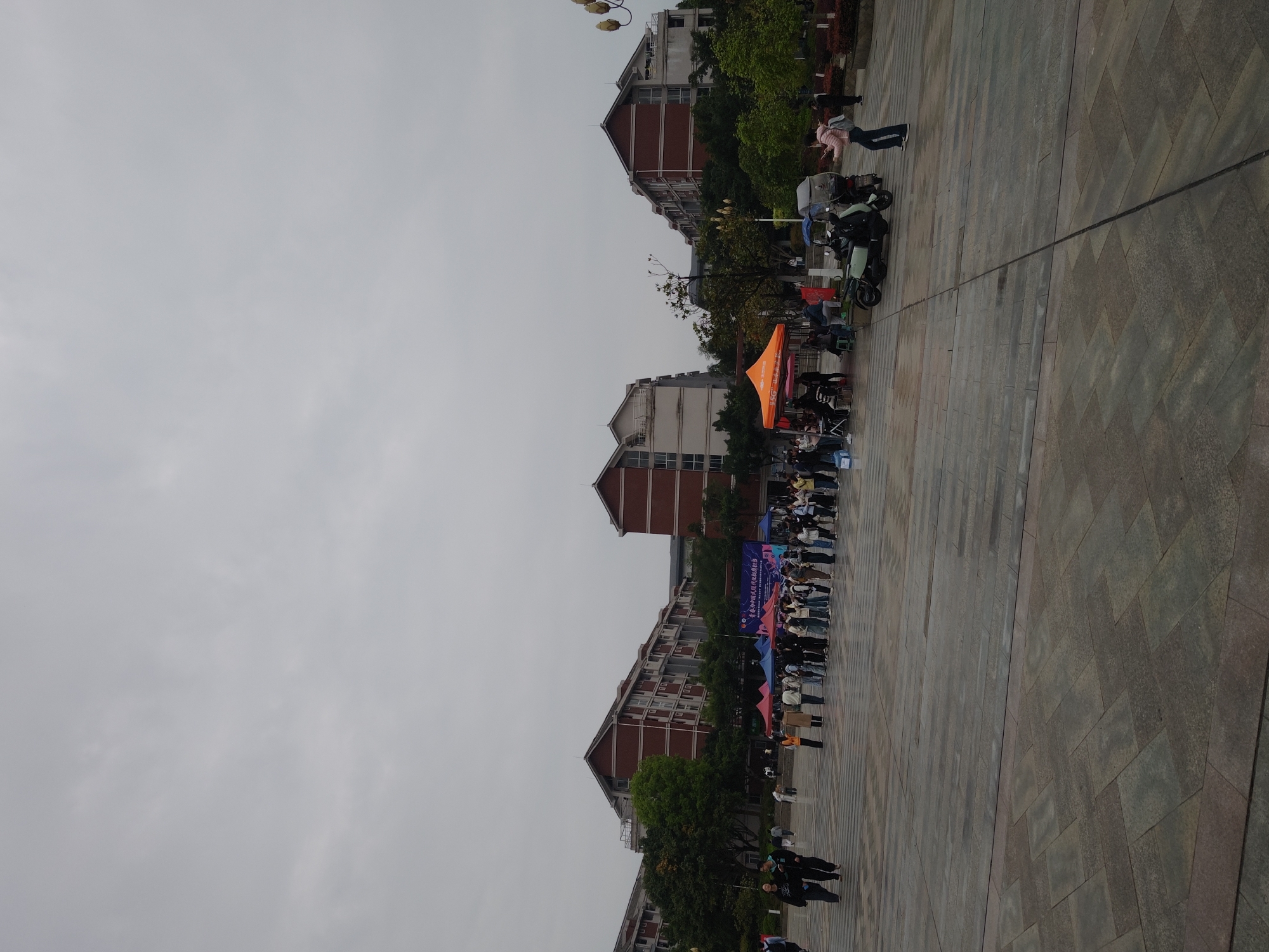 The image displays an outdoor plaza within the Chongqing High-tech Zone, China, under an overcast, gray sky. The ground is paved with rectangular gray and dark gray tiles, showing signs of dampness. In the background, multiple multi-story buildings with red brick facades and white upper levels are visible, partially obscured by green trees. A public event is underway in the mid-ground, featuring a cluster of pop-up canopy tents, including an orange tent on the right and several smaller blue, red, and pink tents towards the center-left. Behind these tents, a large blue banner with white Chinese characters, including elements suggesting "youth/spring" and "modernization," is displayed. A long queue of approximately 30-40 individuals, primarily young adults, forms in front of these tents, extending horizontally across the plaza. Two individuals are walking from left to right in the foreground. On the far right, a person wearing a pink jacket and dark pants stands near two parked motor scooters or electric bicycles, one light green and one dark with a rear storage box. Tables and chairs are visible under some of the tents, indicating stalls or booths. A multi-bulb street lamp is present on the right edge of the frame. Green trees and shrubs are planted around the plaza's perimeter.