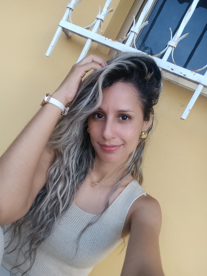 A female subject is depicted in a medium shot, positioned outdoors against a light yellow-orange wall in Trapiche del Medio, Venezuela. She has long, wavy hair with dark roots and lighter, possibly bleached, strands, which she is touching with her left hand, positioned above her head. Her left wrist displays a white-strapped watch with a rose gold-toned face. She wears small gold-toned hoop earrings and a delicate gold-toned necklace with a pendant. Her attire consists of a light-colored, possibly beige or off-white, ribbed tank top or camisole. The subject is looking directly at the camera with a slight smile. In the upper background, a window with dark panes is visible, secured by white, ornate metal security bars.