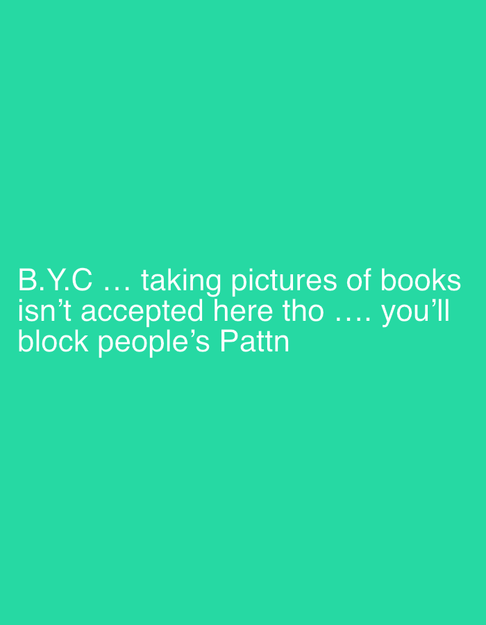 The image displays a textual message against a solid teal background. The white text reads: "B.Y.C ... taking pictures of books isn't accepted here tho .... you'll block people's Pattn." The message appears to be a statement, possibly a rule or opinion, expressed in informal language with abbreviations and implied context. The ellipsis suggests omitted words or a trailing thought.