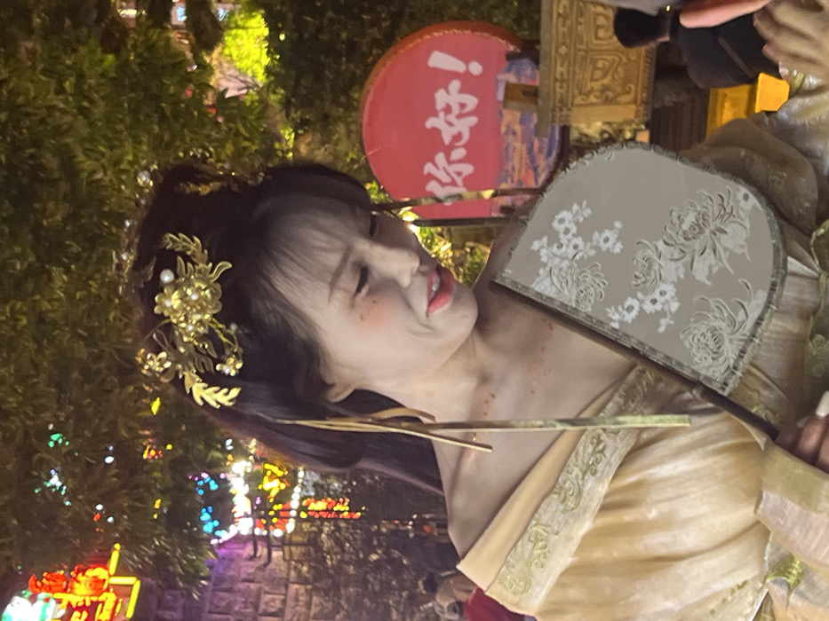 - "An image captured at night in Yuzhong District, China, features an individual, likely a woman, in traditional Chinese attire positioned slightly off-center to the left" by FM-Q07Ys2, licensed under CC BY 4.0