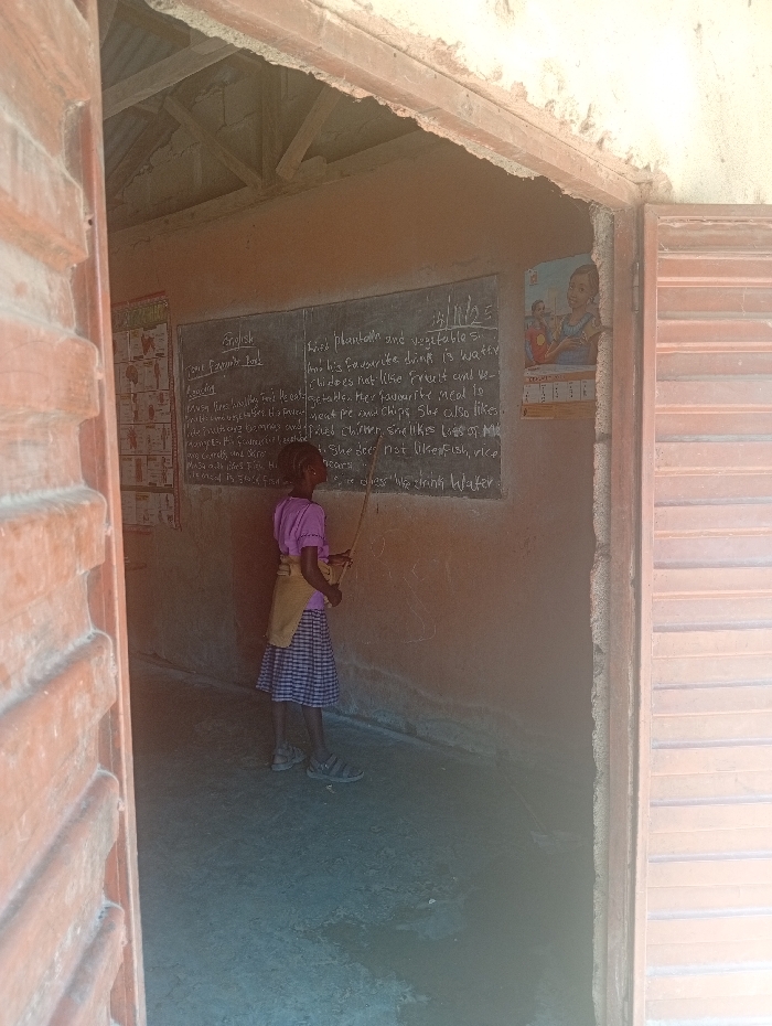 The image depicts an interior view of a room, likely a classroom, in Unguwar Gaya, Nigeria, seen through an open, wooden louvered doorway