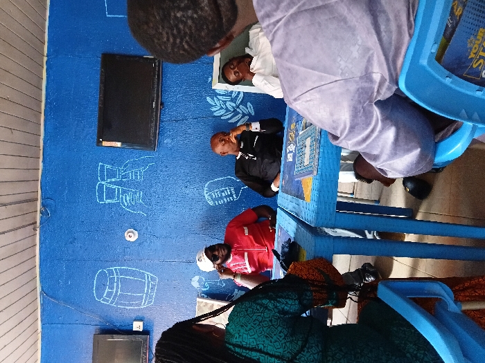- "Four people are gathered around a blue plastic table in a room with blue walls adorned with chalk drawings of beer glasses, barrels, and wheat stalks" by FM-rv6s73, licensed under CC BY 4.0