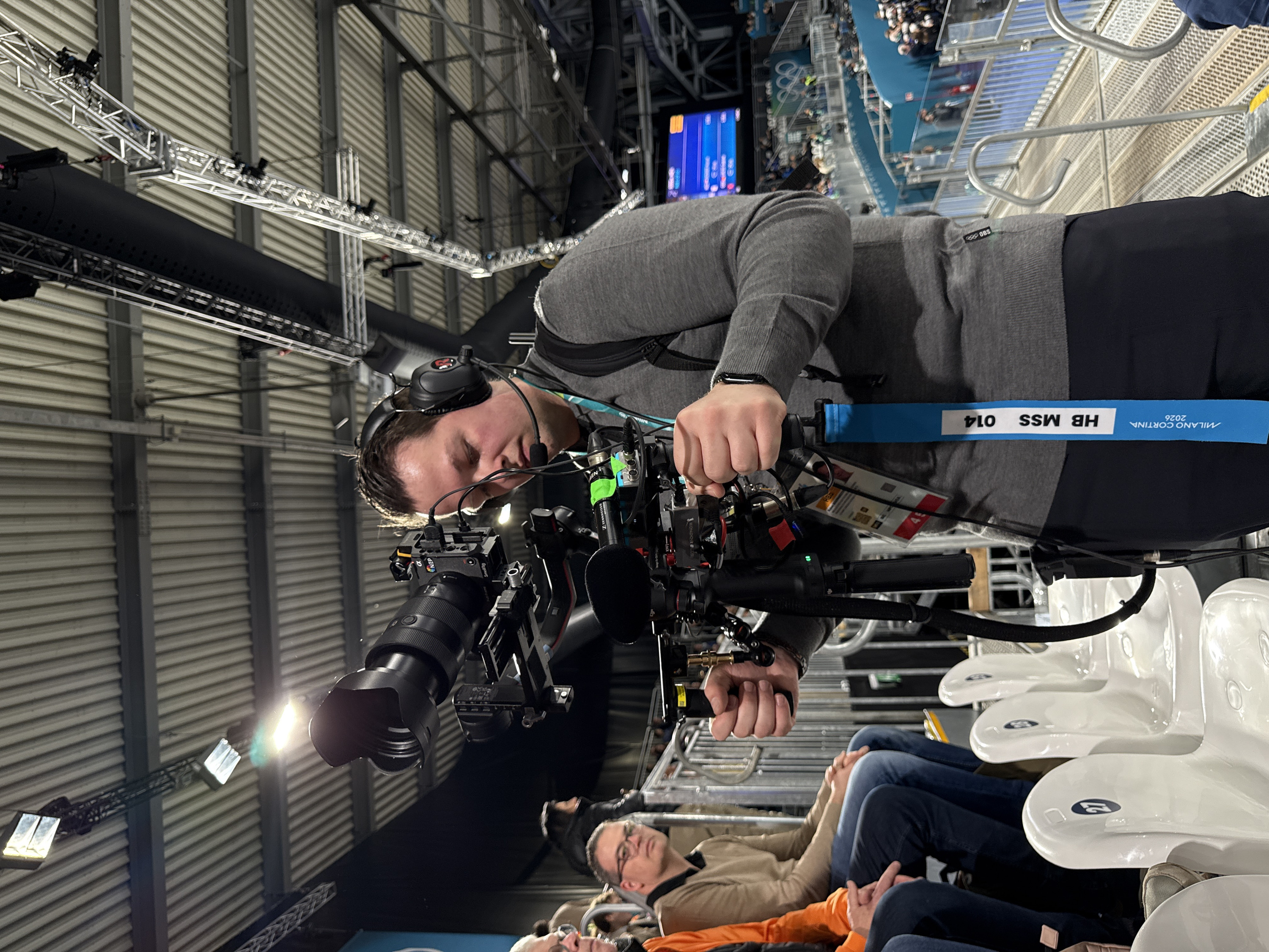 This image depicts an indoor arena in the city of Rho, Italy, associated with the "MILANO CORTINA 2026" event, as indicated by a prominent lanyard. The central figure is a male videographer, appearing to be in his 20s or 30s, with short dark hair, wearing a grey long-sleeved shirt, dark trousers, a black backpack, and a black smartwatch on his left wrist. He is equipped with an over-ear headset featuring a boom microphone. A blue lanyard with "MILANO CORTINA 2026" text and "HB MSS 014" is visible around his neck, along with other credentials. The videographer is actively operating a professional video camera rig, holding its handles with both hands. The rig includes a large camera lens with a hood, "NEP" and "SmallRig" branded components, and "Sennheiser" audio equipment. The camera itself displays a small "α" (alpha) symbol, typically associated with Sony cameras. In the mid-ground, to the left of the videographer, two male spectators or personnel are seated in white plastic stadium seats, one partially visible in an orange jacket, and another in a light brown sweater and glasses, looking rightward. The seats are numbered, with "27" visible on one. The environment reveals a large arena structure with a corrugated metal ceiling, supported by exposed metal trusses and beams. Numerous bright overhead spotlights illuminate the space. Black sound-absorbing material hangs from parts of the ceiling. Metal railings and perforated metal stairways are visible throughout the seating areas. In the background, a large blue digital display screen shows numerical data, likely scores or event information, and the distinct Olympic rings logo is visible on a wall, confirming an Olympic context. Distant, blurred figures populate higher seating tiers.
