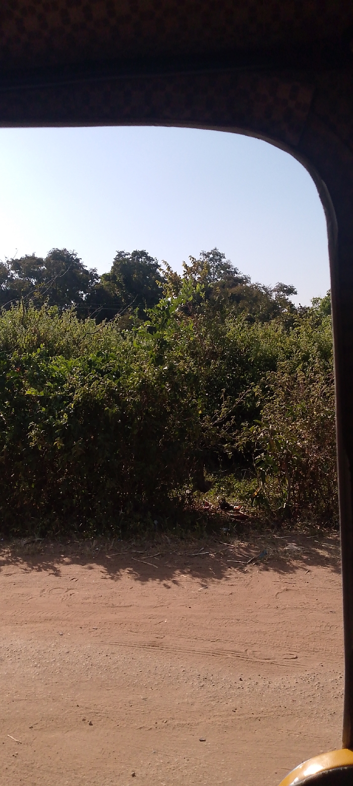 The image displays an exterior scene in Unguwar Saya, Nigeria, viewed from within a vehicle. The upper quarter of the frame shows a clear, light blue sky. Below the sky, dense green vegetation, comprising bushes and trees, dominates the middle ground. Taller trees with darker canopies are visible behind the foreground foliage. The lower half of the frame depicts a reddish-brown dirt road exhibiting faint tire tracks and scattered debris. Shadows from the roadside vegetation are cast onto the dirt surface. The top and right edges of the image are framed by the dark brown, possibly checkered, interior structure of a vehicle, with a small yellow curved element visible at the bottom right corner. No individuals or active interactions are discernible.