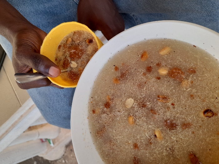 In Narayi, Nigeria, a close-up, high-angle shot captures a person's lap and hands. The subject, wearing blue denim jeans, holds a yellow plastic cup in their dark-skinned right hand. A silver spoon is immersed in the liquid within the cup, which contains a light brown mixture with various particulates, including peanuts and darker granular fragments. To the left, a large white bowl is partially visible, filled with a similar light brown liquid mixture containing numerous peanuts, darker brown bits, and light fibrous material. A white railing structure is partially visible in the upper left background.