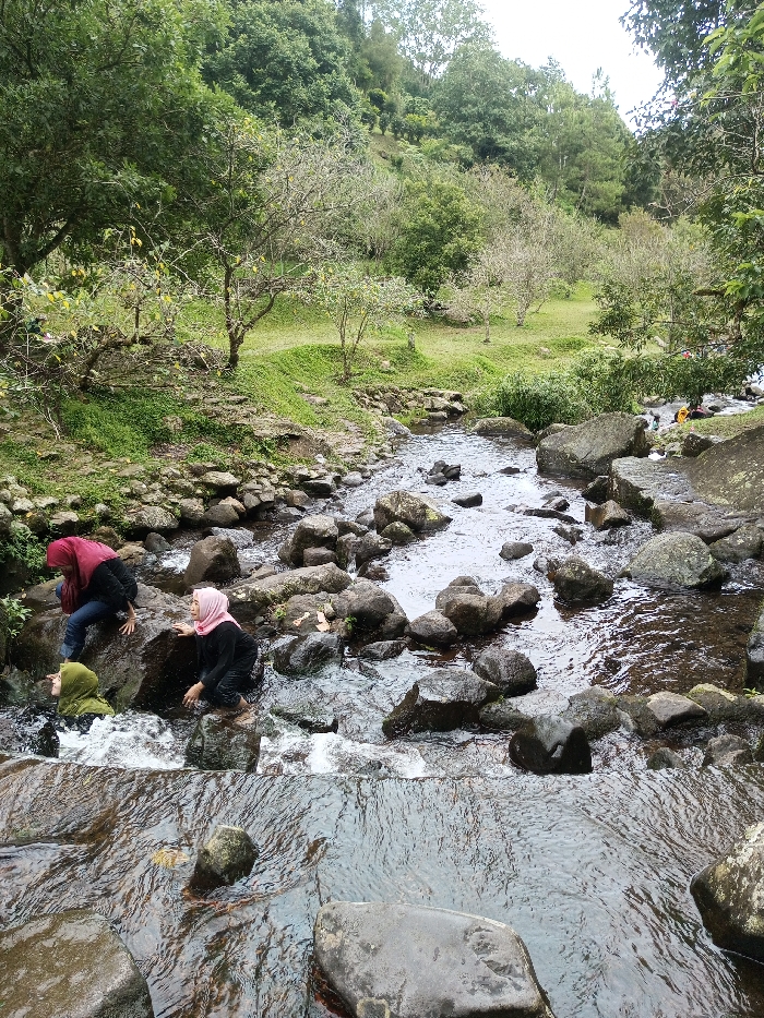 A river filled with rocks flows downhill. Three women wearing hijabs are situated among the rocks, one submerged in the water, one kneeling, and another crouched, reaching out. Beyond the riverbank, a grassy area leads to a forested hillside, with a mix of trees visible. A few people are partially visible further down the river.