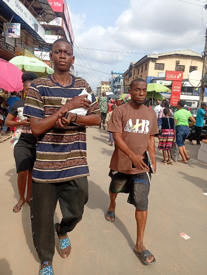 The image depicts a bustling street scene in Fegge, Nigeria, under a partially cloudy sky. The foreground is occupied by two dark-skinned males walking on a light-colored paved surface. The male on the left, a young adult, wears a horizontally striped t-shirt in blue, brown, and beige, dark grey sweatpants, and blue patterned slide sandals. He holds a white packet in his left hand and a dark rectangular object, possibly a mobile phone, in his right hand, looking directly at the camera. To his right, another dark-skinned male, an adult, walks towards the left, wearing a brown t-shirt with a yellow and red "AIR JUST DO IT" graphic, dark denim shorts, and black slide sandals. He carries a black laptop or tablet tucked under his left arm and looks to his left. The background features several multi-story buildings with visible commercial signage, including "UBA" with an "ATM Global Smart" label, "SPARK 401," and "EZEWINNDY GLOBAL LTD." Overhead utility wires crisscross the sky. The street is populated by numerous additional pedestrians of varying ages and attire, suggesting a busy commercial or market area. Market stalls with open umbrellas, one pink and another light green, are discernible along the sides of the street. A small piece of white debris is present on the paved ground in the mid-ground.