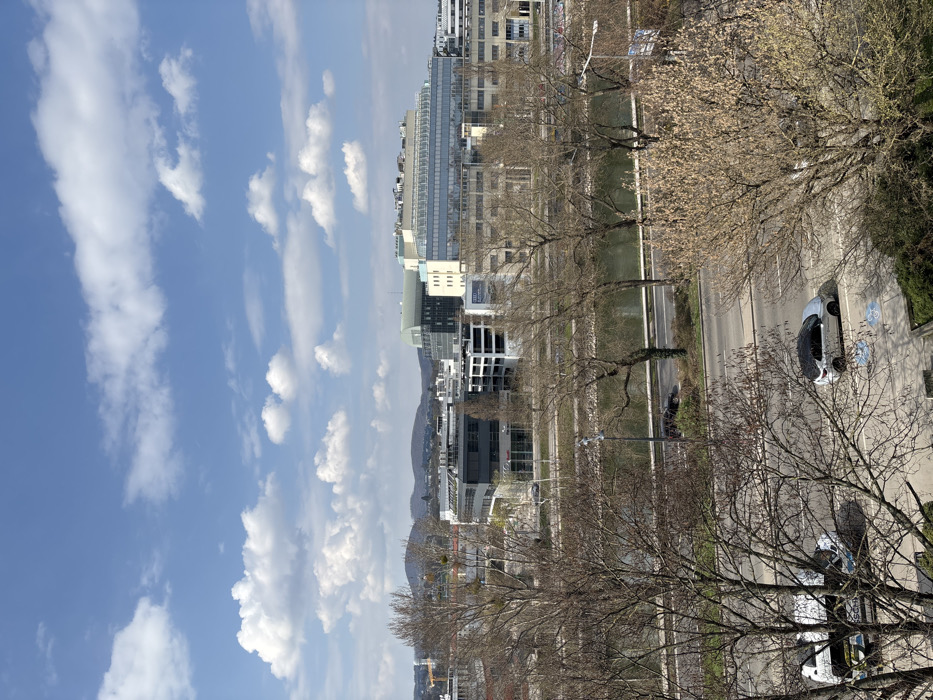 The image depicts an elevated, oblique view of an urban landscape in Vienna, Austria, specifically overlooking the Donaukanal (Danube Canal) and its surrounding areas, looking west-northwest from a vantage point in Leopoldstadt. The scene is illuminated by bright daylight under a sky dotted with scattered cumulus clouds, indicative of late winter or early spring conditions. In the foreground, the bare, intricate branches of numerous deciduous trees, some exhibiting early budding, partially obscure a multi-lane asphalt road directly below the viewpoint. A light-colored sedan with a dark roof is parked on the right side of this road, positioned over blue bicycle lane markings. A white commercial van with blue text is partially visible on the left side of the same road. Shadows from unseen structures and foreground trees are cast onto the road and adjacent ground. The midground features the calm, reflective waters of the Donaukanal, running horizontally across the frame. On the opposite bank, a paved pedestrian or cycling path runs parallel to the canal, followed by a two-lane road. A dark-colored passenger car is observed driving on this road, moving from left to right. Additional leafless deciduous trees line the canal's edge and the roadside on the far bank. The background is dominated by a dense arrangement of modern, multi-story buildings. Prominently featured is a large, contemporary building with extensive glass facades and terraced roof levels, identifiable as the Universitätszentrum Althanstraße 2 (UZA II) building. Adjacent to it are other modern office or commercial structures, including one with a visible "AUDI" sign. The distant horizon is characterized by rolling, vegetated hills, consistent with the Vienna Woods. No individuals are discernible within the frame.