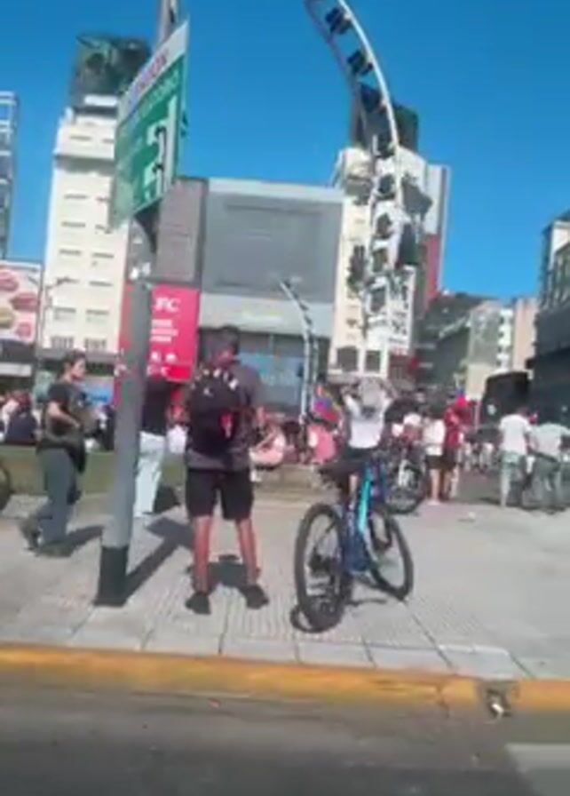 busy street scene on a clear day. In the foreground, there is a yellow curb followed by a pedestrian crosswalk. People are walking around, some with bicycles. A green street sign with a white arrow is visible, along with a traffic light. Behind the people, there are tall buildings with billboards and advertisements. A KFC sign is prominent. Some people are standing together in a group, possibly a gathering or protest. A white car partially enters the frame on the left. The overall environment is urban, with a mix of pedestrians, vehicles, and commercial signage.