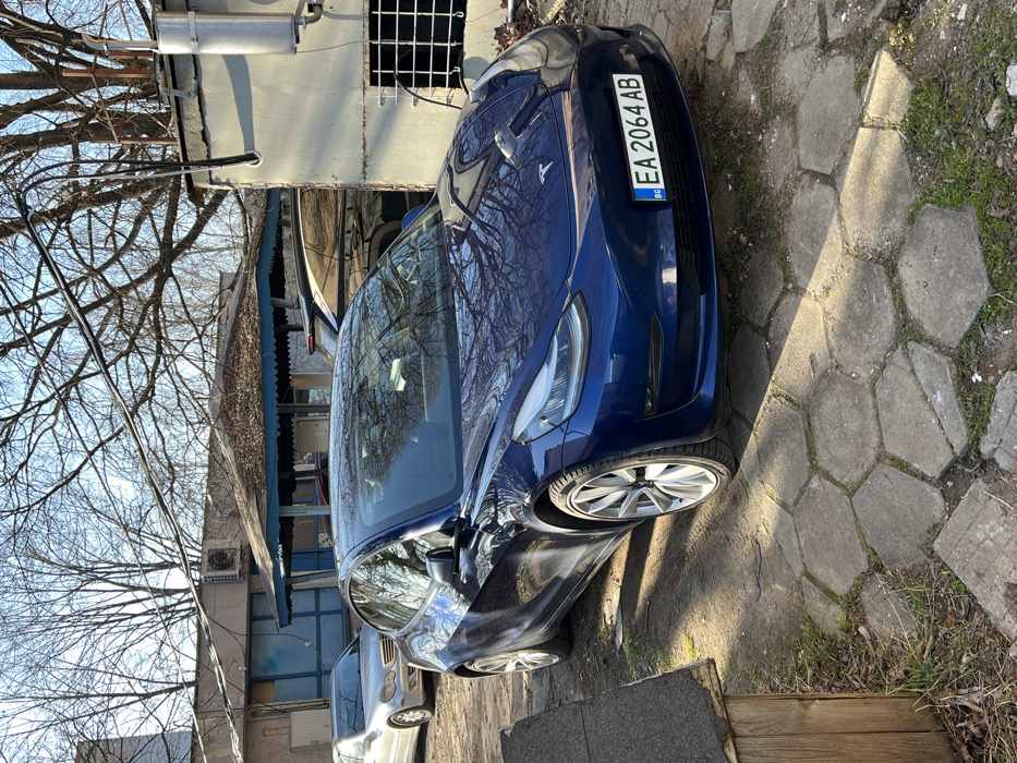 This image captures an outdoor scene in Busmantsi, Bulgaria, on what appears to be a clear day. Centrally positioned is a dark blue Tesla Model 3 electric sedan, bearing Bulgarian license plate "BG EA 2064 AB" on its front bumper. To the left and slightly behind the Tesla, a silver Mercedes-Benz sedan is partially visible, parked facing left. A dark-colored SUV is partially obscured behind the Tesla. The ground consists of hexagonal concrete pavers interspersed with dry grass and exposed soil. In the background, a light-colored building with a blue-trimmed, covered porch and a brown, textured roof is visible. An external air conditioning unit is mounted on the wall above the porch. To the right, a second light-colored building features a barred window and an attached vertical cylindrical fixture. Bare deciduous trees with intricate branch patterns are silhouetted against a clear blue sky, casting reflections on the Tesla's body. A small, wooden structure with a sloped roof is present in the lower-left foreground. No individuals are present in the scene.