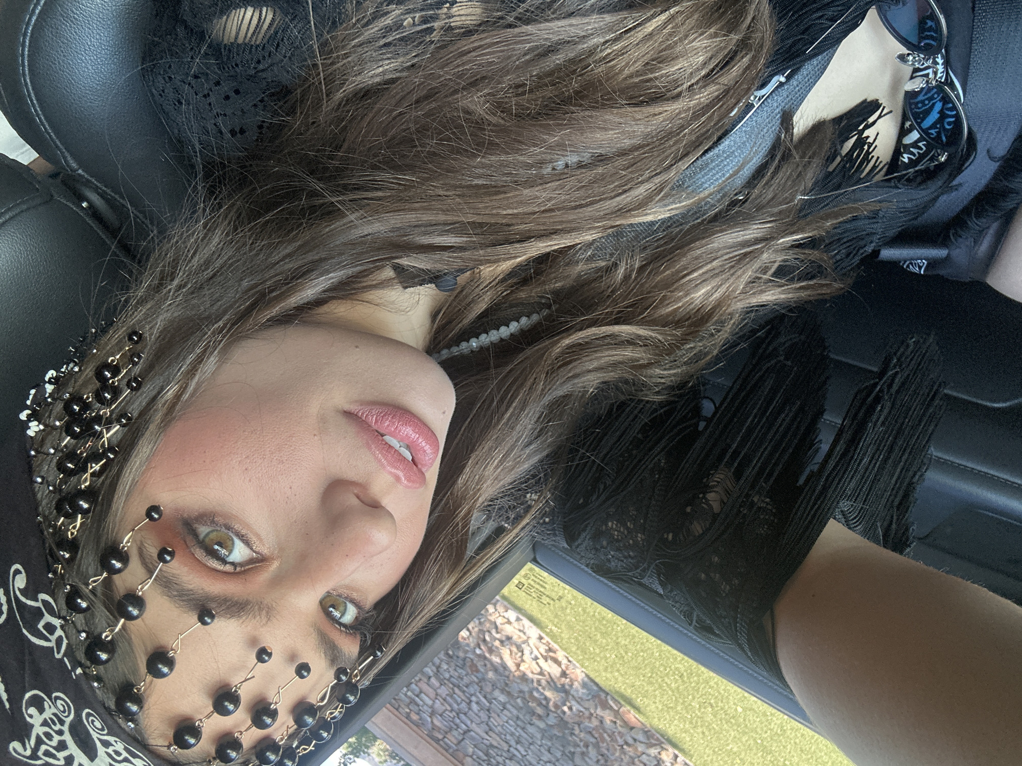 A female with brown hair and light eyes is in the driver's seat of a car. She is looking up at the camera. She has a beaded headpiece with gold accents. She is wearing a black shirt with black fringe detailing. The car is stopped in front of a stone wall, presumably in a residential area. Based on the location, the photo was taken in Rancho Mirage, United States of America.