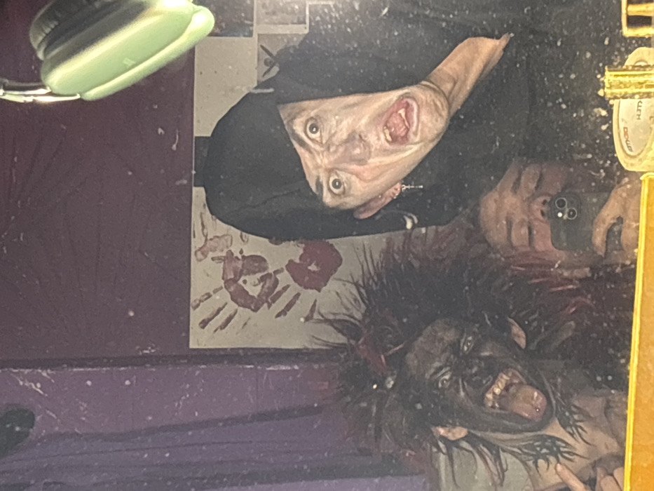 An interior in Saratov, Russia, is depicted through a mirror reflection capturing three individuals. In the bottom-center of the frame, a person with reddish hair and light complexion holds a dark-colored smartphone, likely an iPhone, which reflects their face with eyes directed downwards, indicating they are taking the photograph. To the left, an individual with extensive black facial and neck paint and spiky, dark red hair is captured mid-scream, mouth wide open, exposing teeth and a pierced tongue. A dark, stylized tattoo pattern is visible on their left neck/shoulder. Their left hand is raised, forming a "rock on" gesture. To the right, another individual, partially obscured by a black hooded garment, displays a distorted, wide-eyed, open-mouthed grimace. A silver-colored earring, possibly a small cross, hangs from their left ear. The background reflected in the mirror features a dark purple or maroon wall. Affixed to this wall is a light-colored rectangular panel or paper displaying two distinct red handprints, resembling bloodstains. In the upper right corner, a pair of light green over-ear headphones is visible. The immediate foreground, at the bottom of the mirror, shows a yellow surface, upon which a roll of adhesive tape with partial Cyrillic text and a gold-toned cylindrical object are present. The mirror surface itself is speckled with numerous small particles, consistent with dust or fine debris.