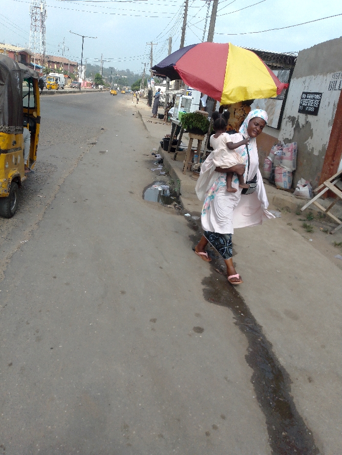 A woman in a white headscarf and dress carries a child on her hip, walking along a gray street in an urban area. Behind her, a colorful umbrella shades a market stall. A yellow auto-rickshaw is parked on the left, and buildings line the street in the background. The road surface has a wet patch. Overall, the scene conveys a sense of everyday life and commerce.