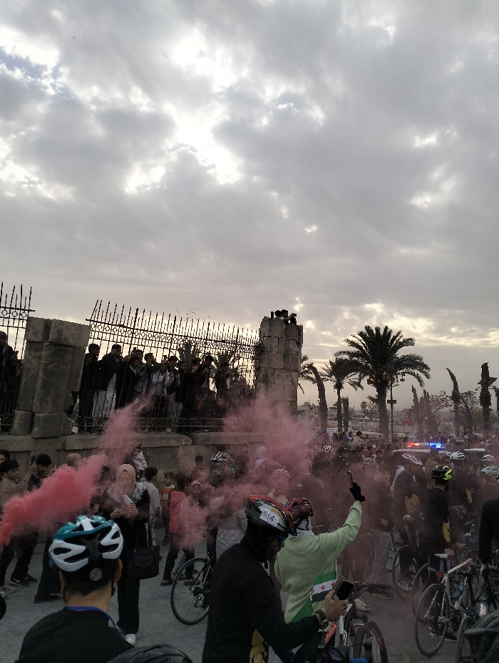 A crowd of people, many on bicycles, gather near a historic stone structure under a cloudy sky. Red smoke fills the air, obscuring some of the crowd. Some people are standing on the structure, while others are on the ground. Several palm trees are visible in the background. Red and blue lights from an emergency vehicle illuminate the scene, suggesting a public event or demonstration.