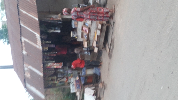 A roadside shop with a corrugated metal roof displays various items. A woman in a red patterned dress and headscarf stands next to a wooden table, presumably a customer. A person wearing a red shirt stands inside the shop. The shopfront is lined with goods, suggesting a small business. The background shows a road or street.