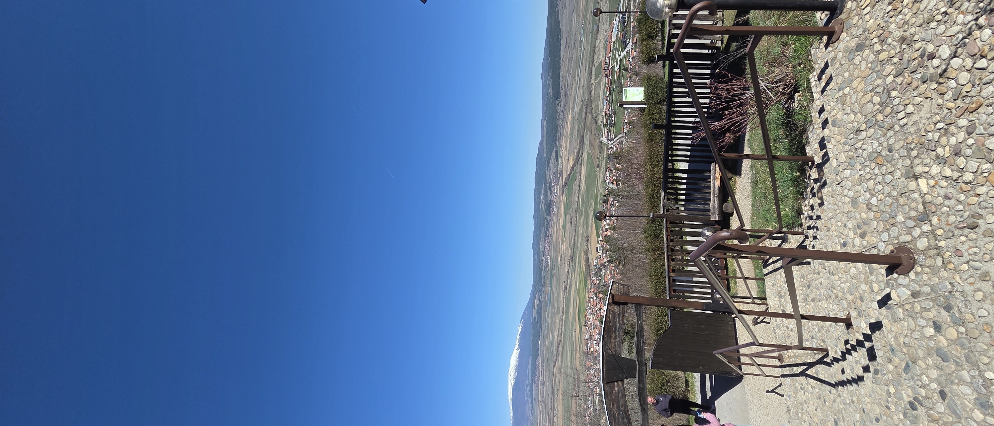 View from the observation deck above the medieval fortress of Belchin, Bulgaria. A clear blue sky dominates the view. Below, the valley unfolds with fields, villages, and a distant snow-capped mountain range. A railing and viewing platform are in the foreground. Two people are standing by the platform. The ground is paved with small stones.